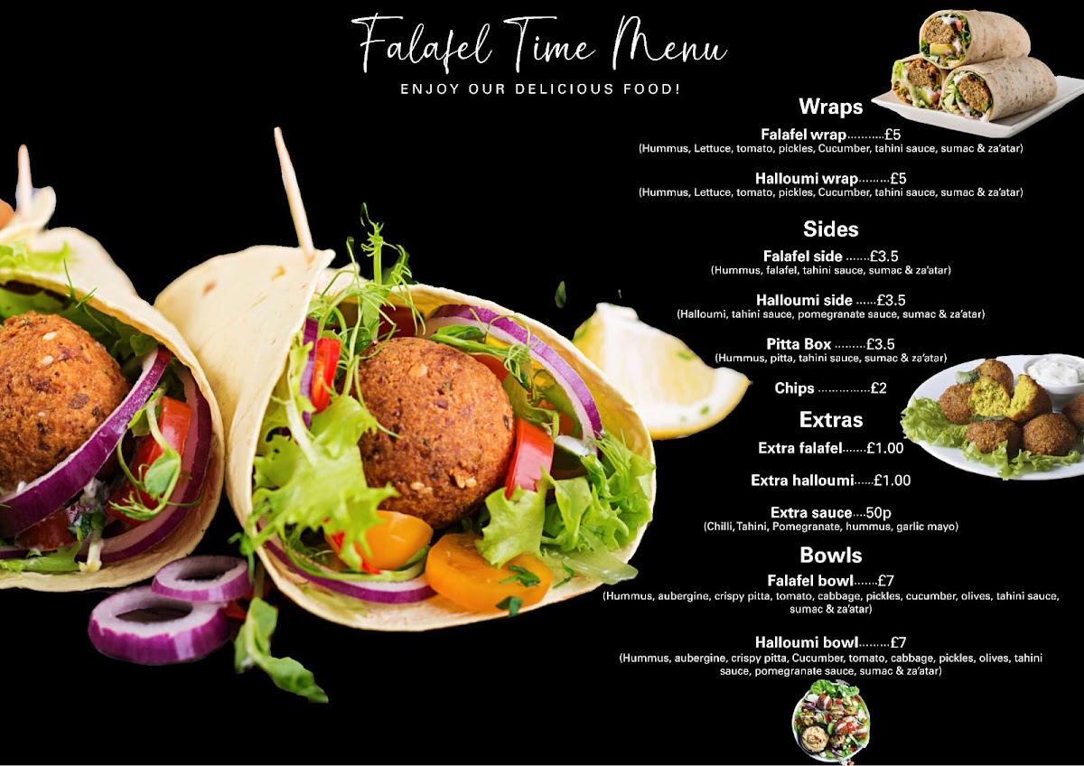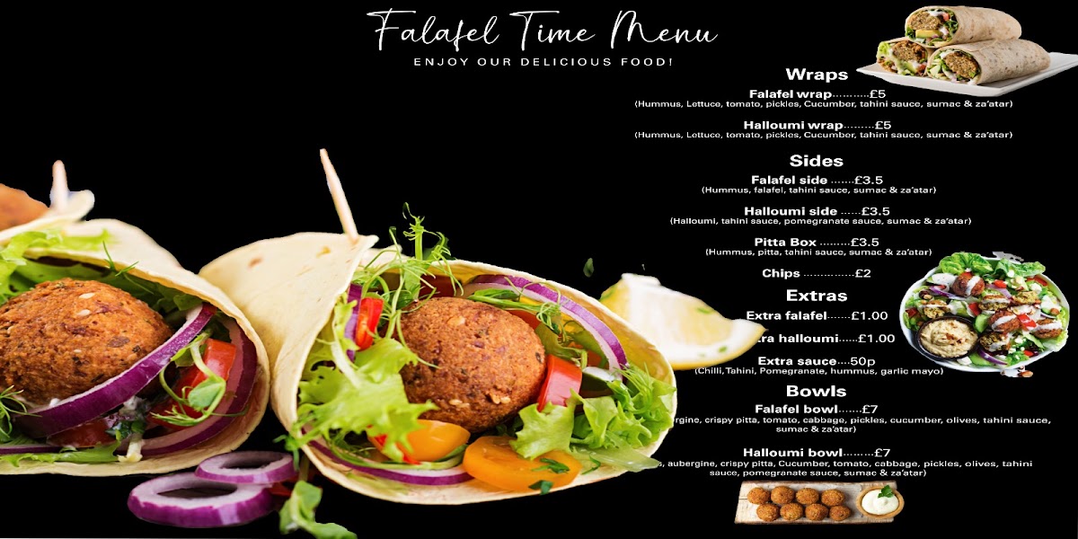 Crispy, golden falafel balls are wrapped in soft tortilla bread with creamy hummus, fresh lettuce, juicy tomato, tangy pickles, a sprinkle of aromatic za’atar, and a smooth drizzle of tahini sauce. A wholesome, flavor-packed choice for plant based food lovers